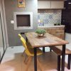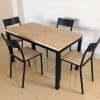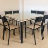 Mesa metalon com tampo MDF e vidro e cadeiras encosto chapa assento MDF.